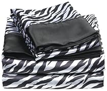 Enchanted luxurious satin sheet sets in a great black and white zebra print. These smooth silky sheet sets add a luxurious touch to any bed. They are made of 100% woven polyester satin. The pocket depth is 14-inch made to fit up to a 17-inch deep pocket mattress. The fitted sheet has elastic all the way around as well to insure a great fit. The pillow cases & flat sheet have a solid black 4-inch hem The sheets are machine washable and easy care. Each set comes with a flat sheet fitted sheet and two pillow cases.